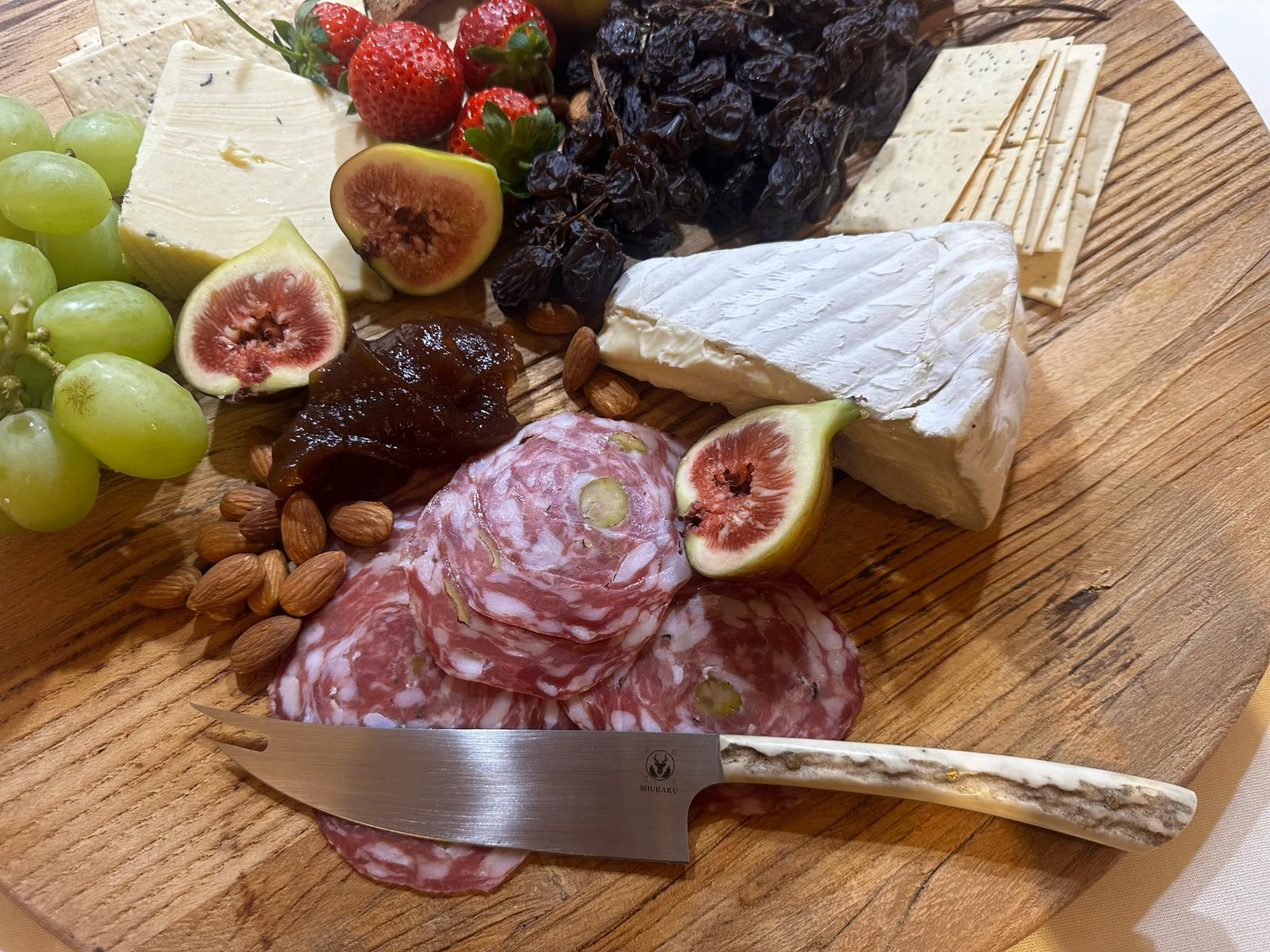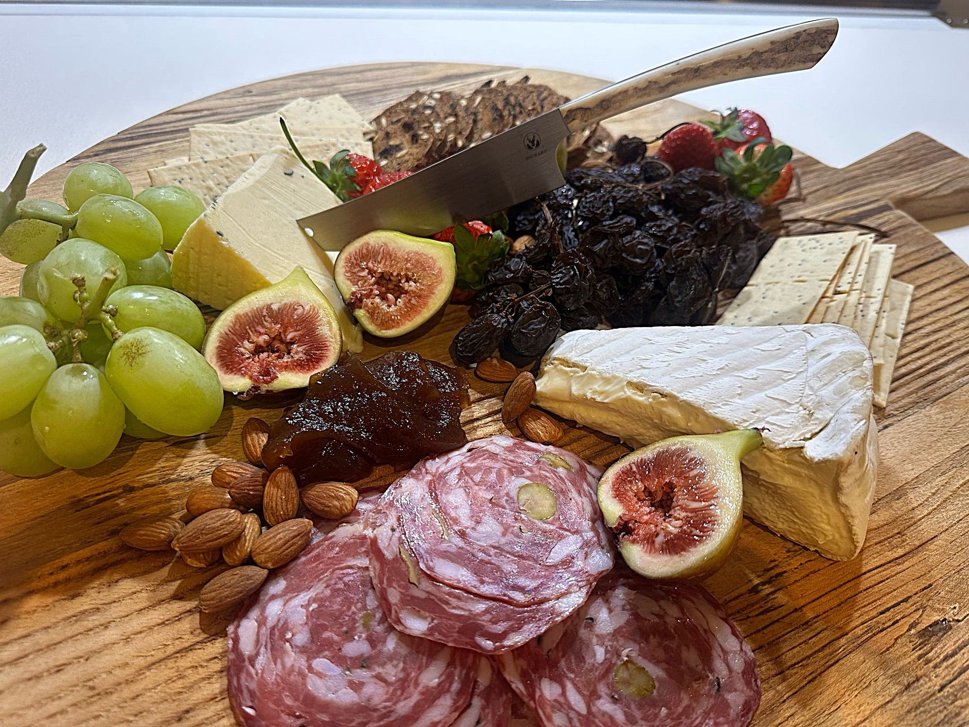 Elegantly forged with a curved, pointed blade for slicing and serving. Finished with a polished Rusa antler handle – perfect for entertaining and artisan boards.